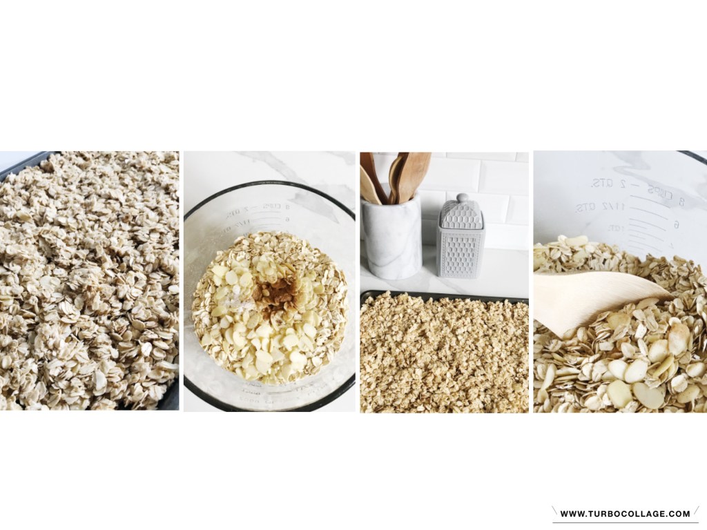 - In one bowl combine the dry ingredients- oats, sliced almonds, salt and cinnamon. Stir to blend.