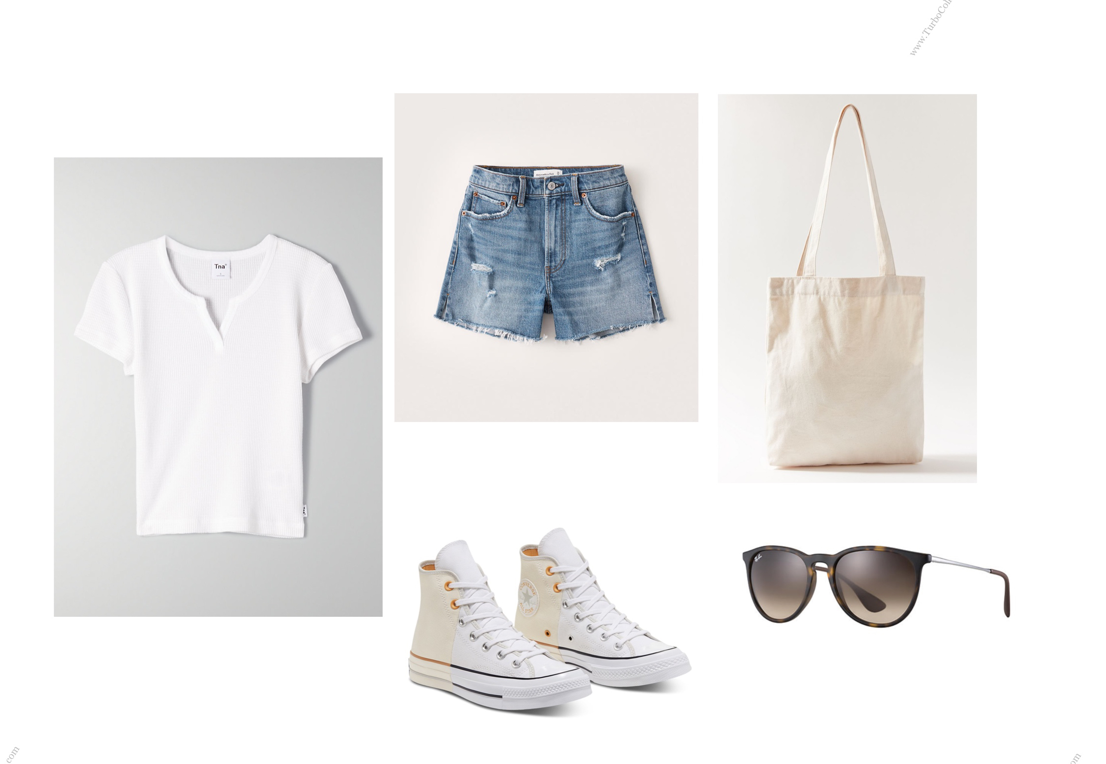 Lastly I put together an exploring day look for Abbey. A day of exploring means that you need to be comfortable so I started with these amazing converse. I thought they were such a cool twist on a classic white sneaker with the two colours. A white T-shirt is another staple and paired with these jean shorts is the perfect look. I thought this canvas bag was perfect because it played off the colours in the shoes, added a cool element but was still minimalistic. Overall this look is a cute but comfortable look for a day of exploring and walking around.