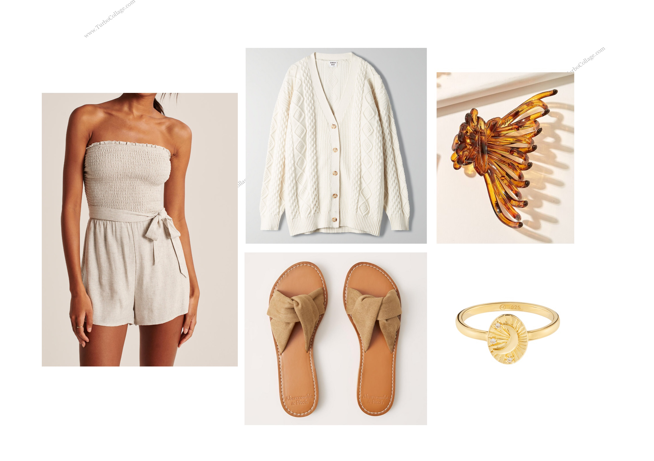 An at home look is essential these days and I knew I wanted to create a super cozy and neutral toned outfit for Abbey. Again I wanted to choose basic items to be in line with her minimal style but with an elevated twist. A perfect example of this is with this romper, it is super comfortable to wear and an easy go to but the linen fabric and tie adds extra details. Abbey is also known for wearing a lot of rings so I knew I wanted to include one in this look. This gold one from mejuri was the perfect option. Lastly this cardigan just makes the look for colder summer nights!