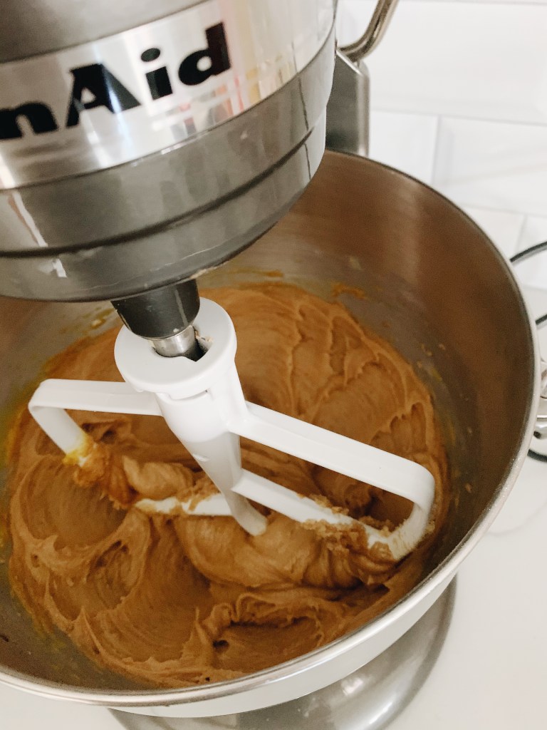 - Once mixed add the peanut butter, vanilla, and egg and beat on high speed until combined.