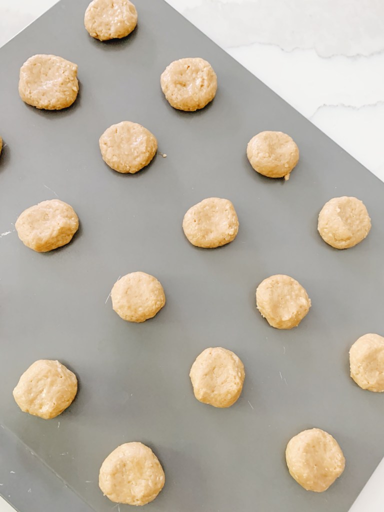 - Scoop cookie dough into balls (about 1 tablespoon in size) and arrange on baking sheets. Use the back of a spoon or cup to lightly flatten each ball so they spread out more during baking.