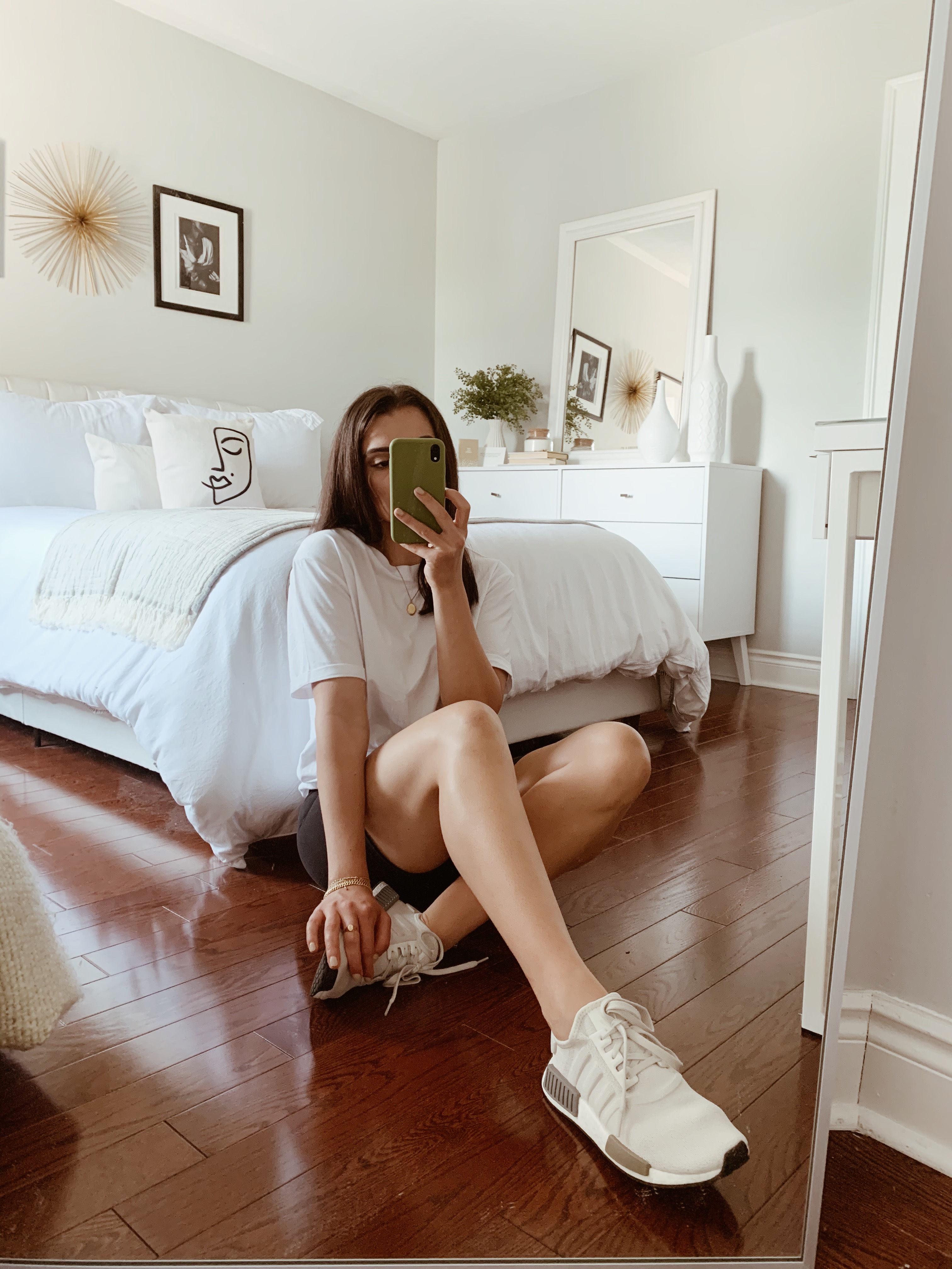 The first look I put together with these bike shorts was a classic athleisure look that we all know and love. I see biker shorts as the summer legging, but with more of an edge making them so versatile. I love them paired with this simple white tee from Oak + Fort, which by the way is the BEST white tee I have ever found. These shoes add to the athleisure vibe I was going for as well. This is the perfect outfit to wear day to day.