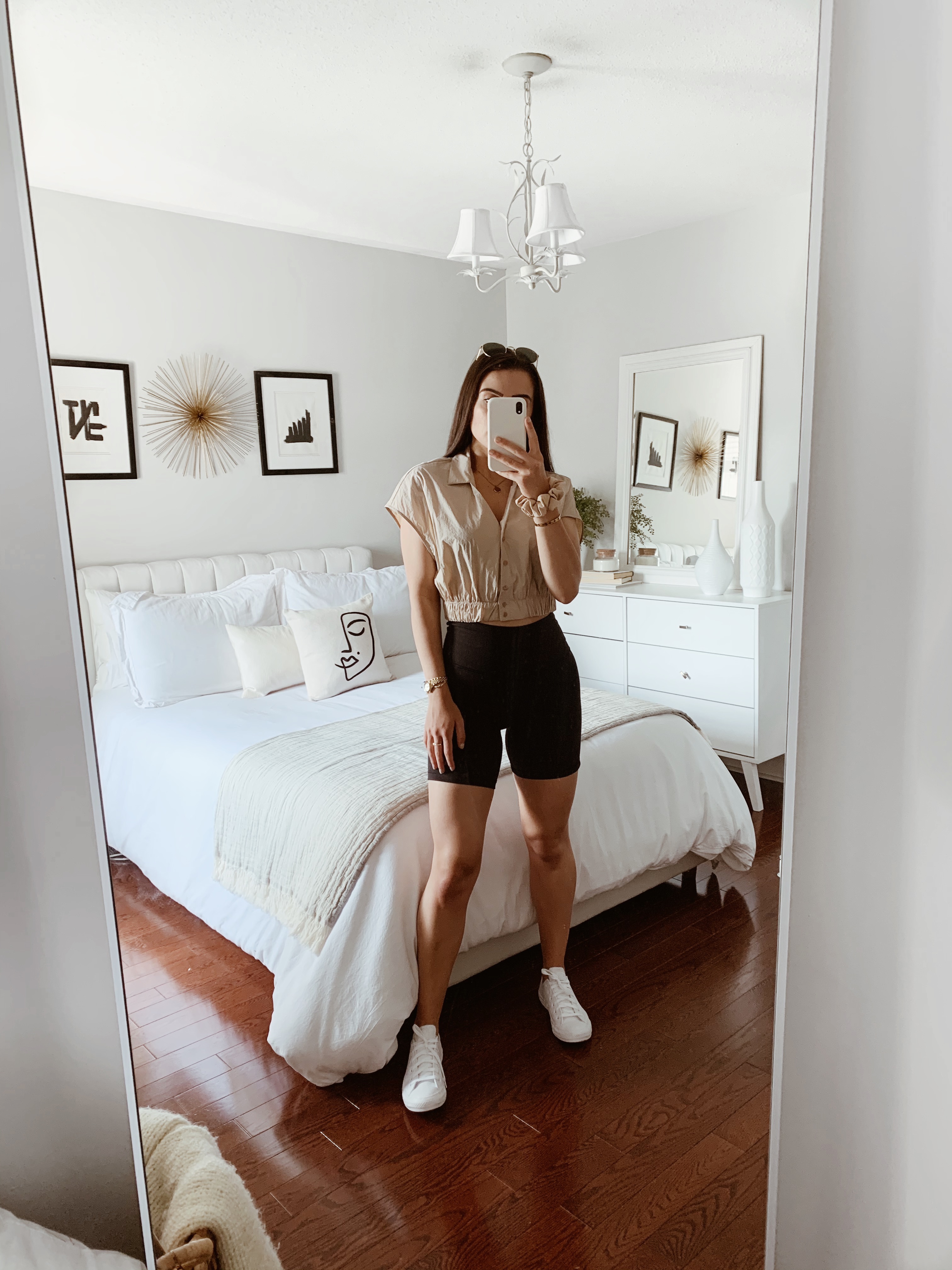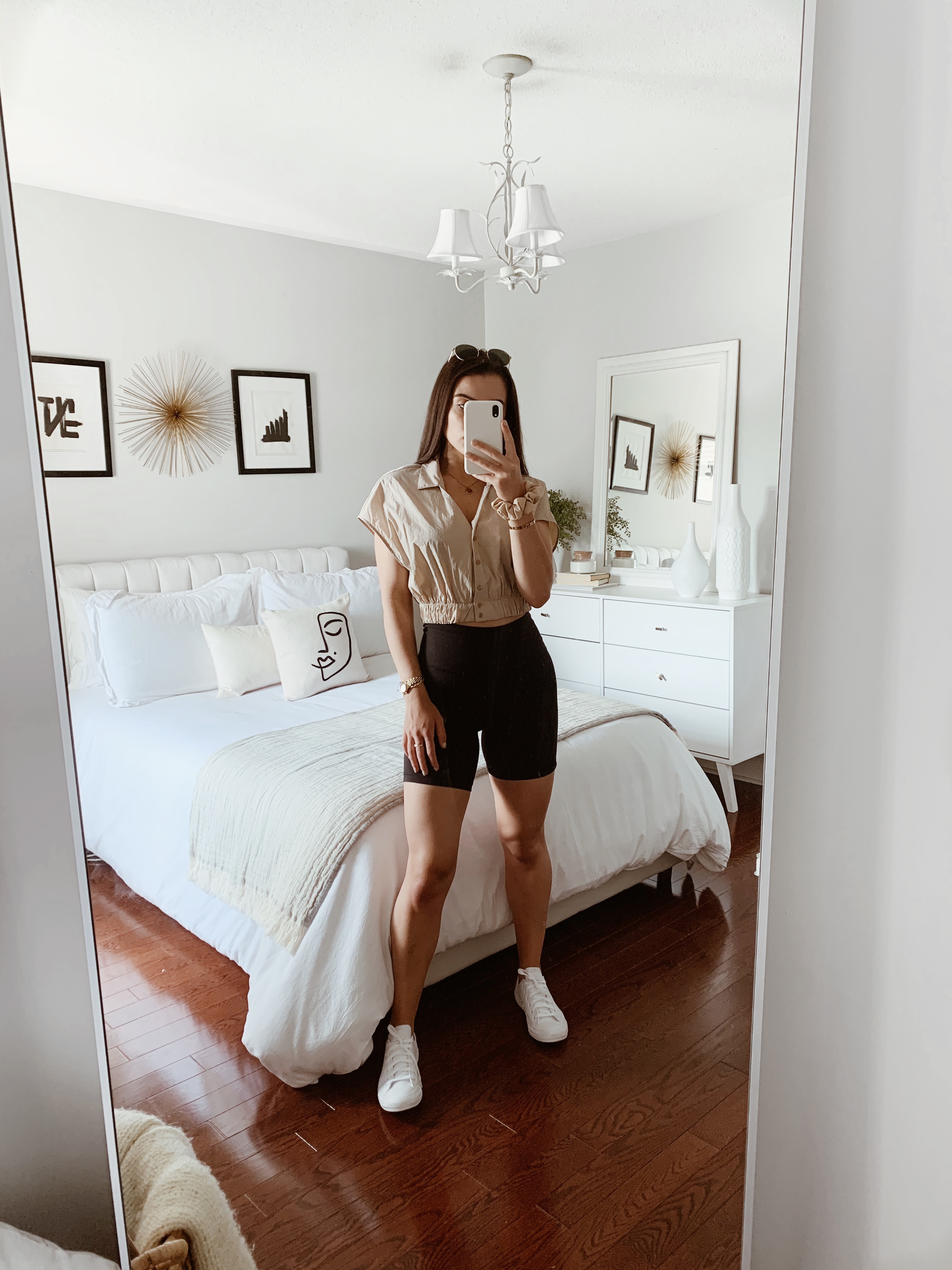 The inspiration for the third look was athleisure meets dressed up. This top from Zara is like a windbreaker material, because of that the dressed up silhouette gets the athletic vibe added to it. Sadly, this exact top from Zara is no longer available but I have linked a very similar option! I put on these sunglasses as an accessory to add detail to the outfit. I paired it with white sneakers as well because I still felt like I needed to balance out the casualness of the bike shorts with the rest of the outfit.