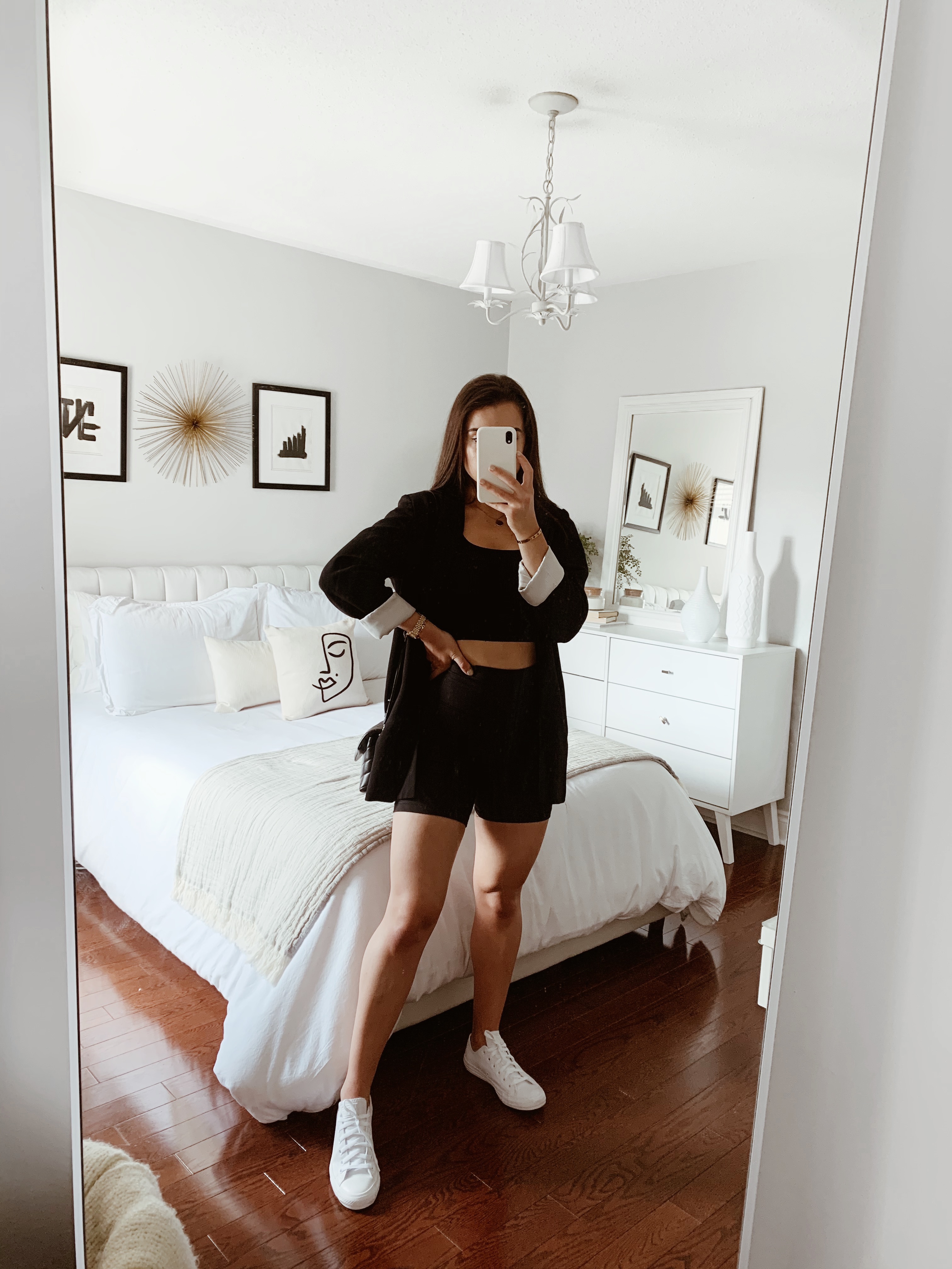 With the second outfit I put together I wanted to demonstrate how easily bike shorts can be dressed up. I feel like the oversized blazer paired with the biker shorts is such cool look. The monochromatic colour makes it sleek with the added gold accessories. This has to be one of my favourite looks that I put together!