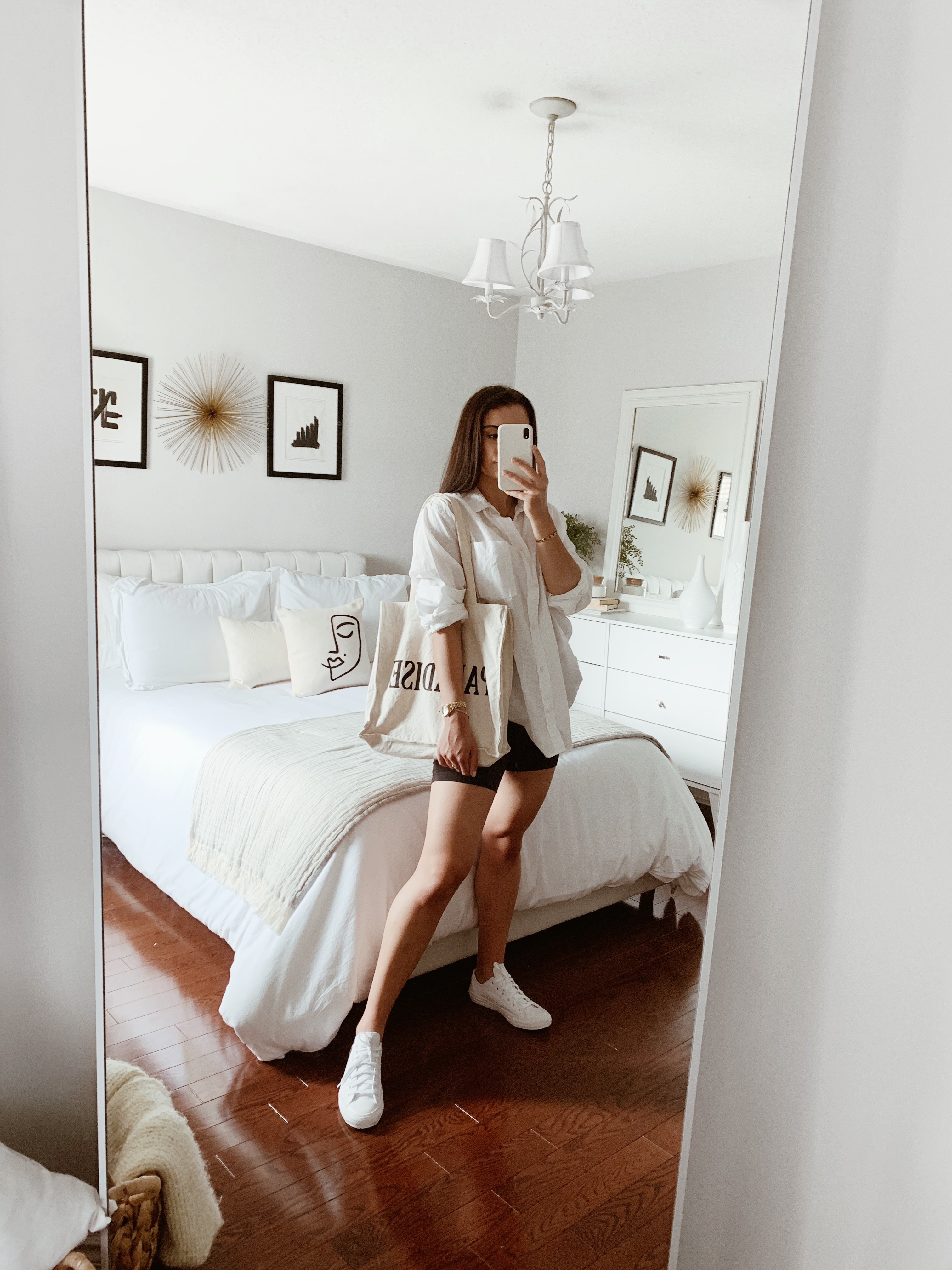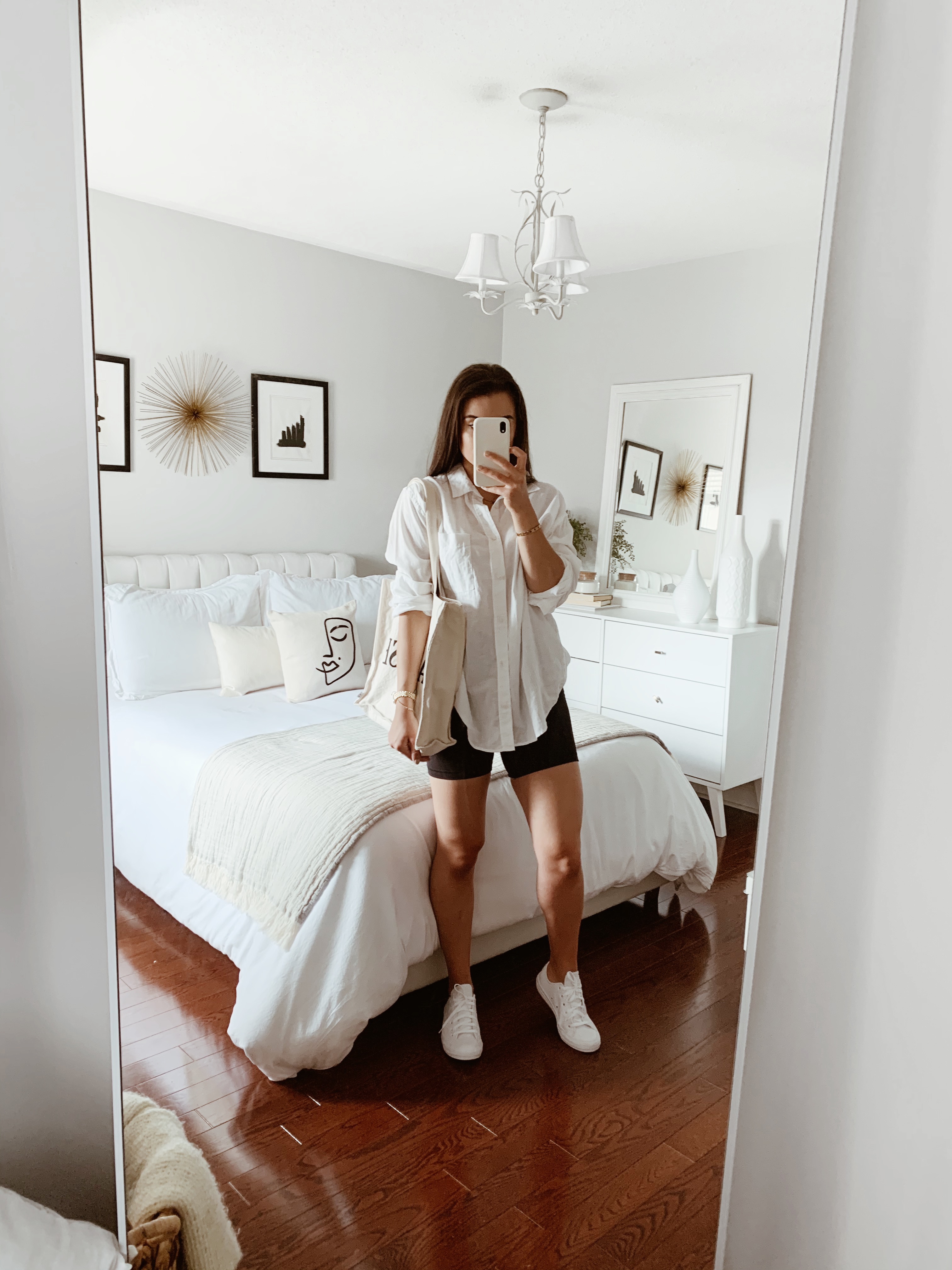 I have worn this outfit more times then I can count already. It is such a cool look while also being comfortable. With this look I wanted to play on the oversized t-shirt with bike shorts trend but give it a twist. This linen button down is actually from the mens section of H&M, making it super oversized and perfect for bike shorts.
