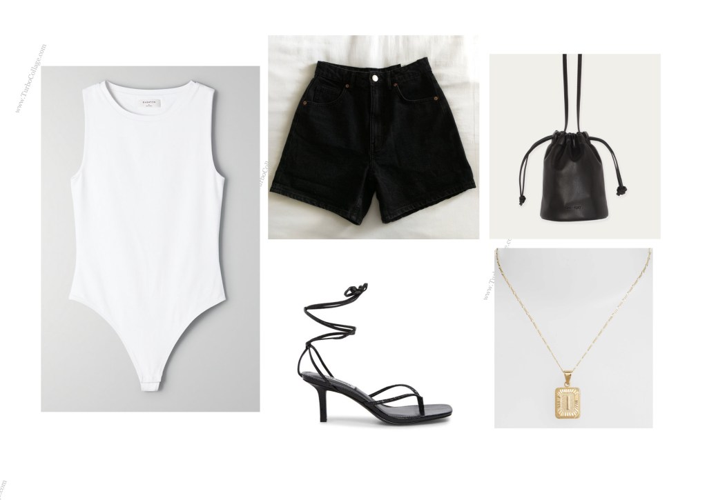The next look I put together for her was for a night out with the girls. I wanted to make the look dressy while also staying true to her trendy and sporty style. I knew that the casual and relaxed Mom fit shorts paired with the contrast of the dressy strappy heels was the perfect way to achieve this look. The two balance each other out in the best way. I thought to keep the top simple with a white body suit and gold necklace. I knew this was the perfect bag to complete the look, a bucket bag is a twist on a classic black crossbody making something simple be anything but boring.