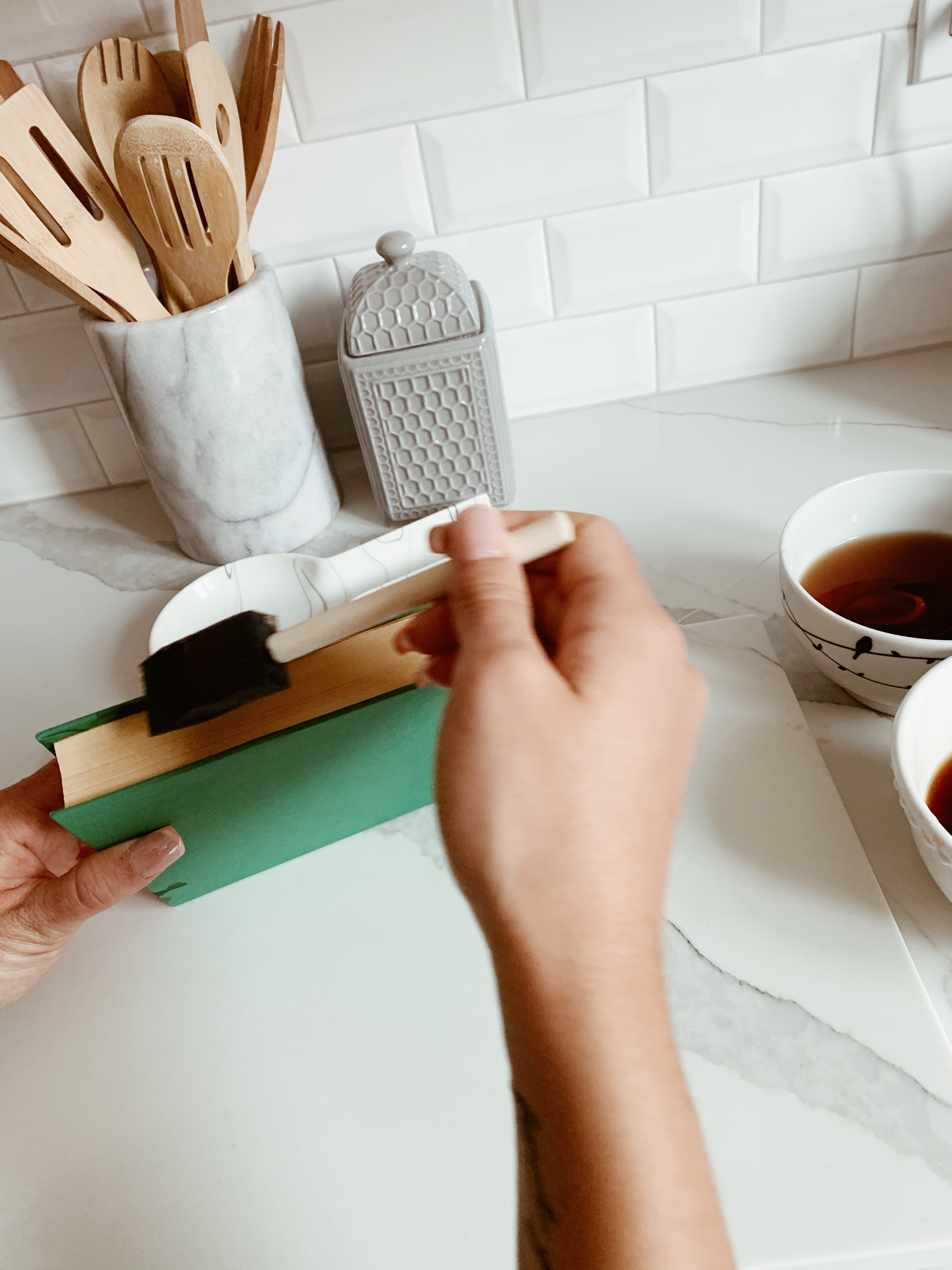 Some important things to keep in mind with this DIY is that the colour of your pages will vary depending on how many times you coat them with your tea. The more you do it the darker your pages will be and the less the lighter they will be. I did a variation as I wanted the colours of my books to be slightly different to really give them that unique vintage look. Another thing is that after you have completed the tea bag step you can either choose to paint your books or wrap them in some wrapping paper. It is all preference. I again did a combination of both to give them a different feel. Wrapping them keeps them sleek looking but painting them gives them a beautiful and almost imperfect affect that really goes with the vintage look.
