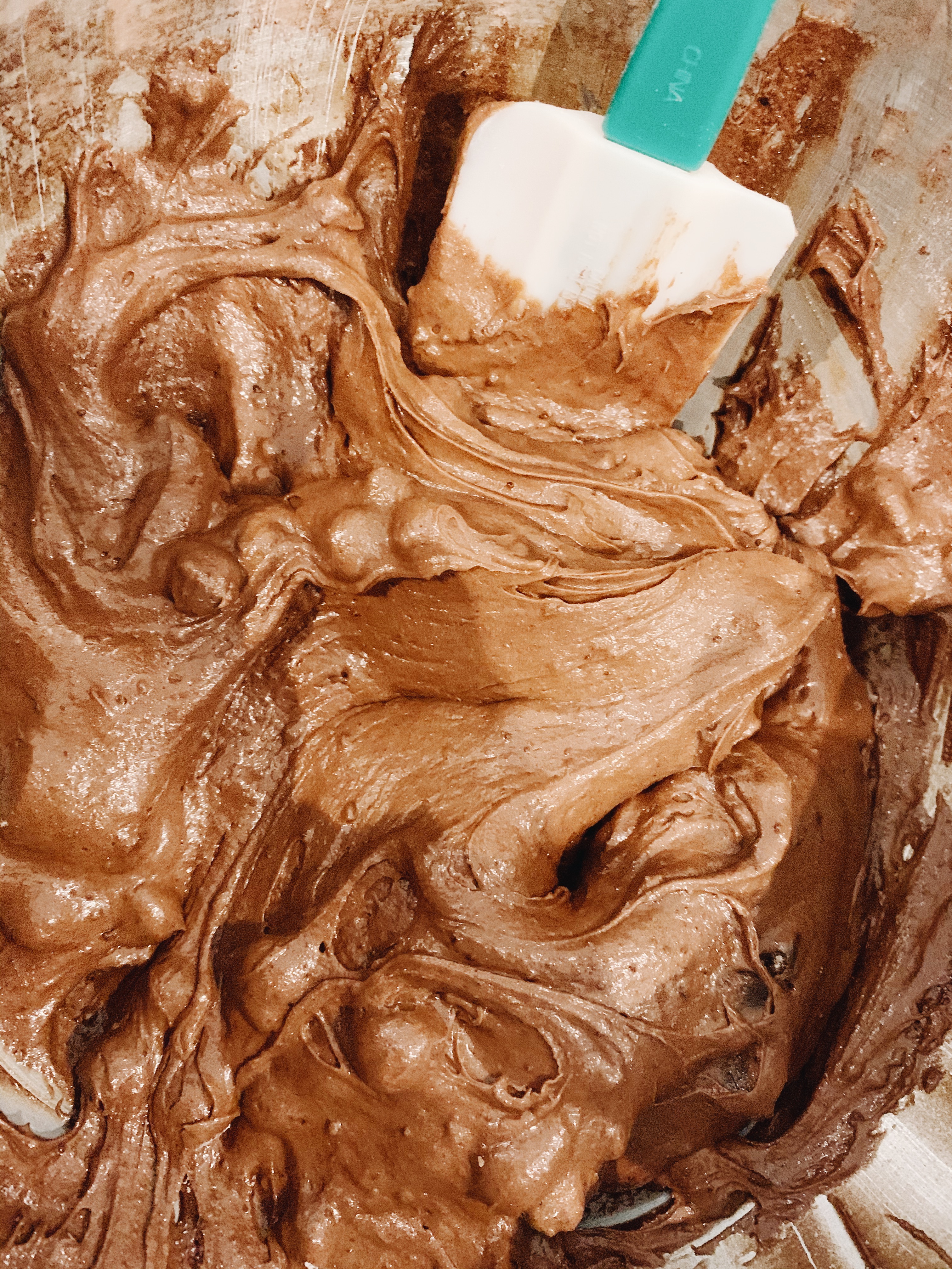 - Add in your peanut butter and use a knife or fork to incorporate it into your brownie mixture (giving it almost a marbleized effect) until it is spread out evenly.
