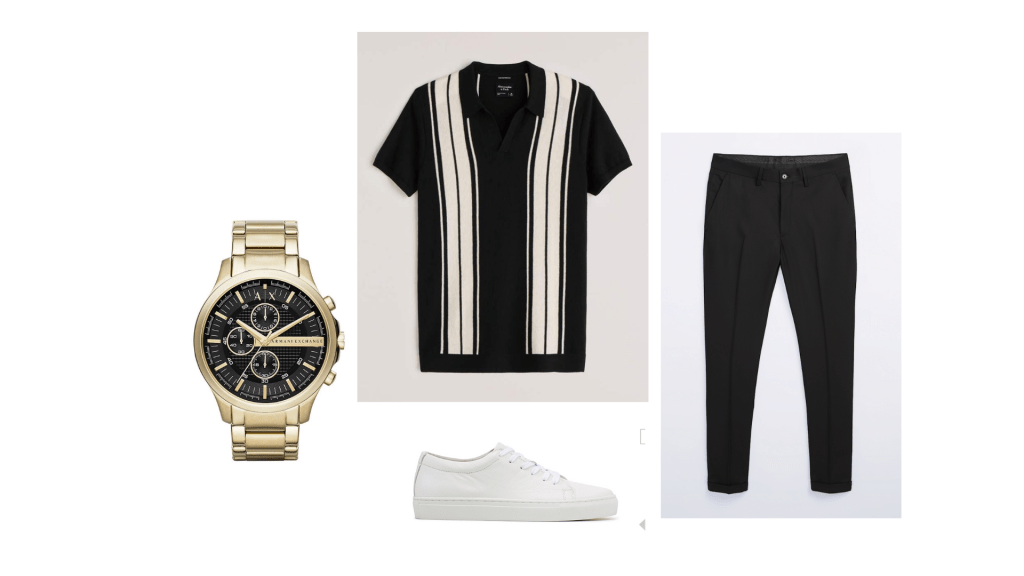 The first look that I put together for Marcel was a club look, for when they eventually open of course. My idea was for the look to be monochromatic. I found this stripped shirt first and thought it was a elevated take on a classic polo. To go with the shirt I paired some black dress pants. You always need A Little Touch of Gold so I added this super cool watch by Armani to elevate the look and add a pop. You can never go wrong with some white sneakers, they can be worn time and time again and they balance this look out and compliment the stripes on the shirt. Yes white sneakers may not be practical for a club so he can always opt for some black boots or sneakers instead. Overall I think this is such a cool but classy club look that he would look great in.