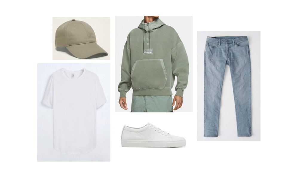 This look is a very ‘Marcel’ look to me and something that I knew for sure he would love. It is the perfect mix between his sporty and smart casual style. I started with this super cool sweater from Nike. This colour is so in for this season and the style of is so unique. Under it he could wear this white t-shirt that would peak out at the bottom, adding some layers and therefore interest to the look. You can never go wrong with some white sneakers. These ones are just a simple white sneaker that can be worn with so many different outfits. Lastly, I added the hat to play on the sage green of the sweater. Overall I think this a super cool everyday look and something he would totally wear!
