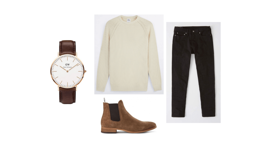 For the date night outfit I put together a look based on what I have seen him wear in the past but elevated it and made it fall appropriate. I started with a classic pair of black denim since they are a little more dressy then a light wash denim but still not a dress pant. I then found this Zara cream sweater that I thought he would love and would look great on him. He does not currently have a pair of chelsea boots in his wardrobe. Since they are such a great staple to have, to dress up or down I thought I would find him the perfect pair and add them to this look. These ones are the perfect height and shade of brown. Lastly, I accessorized with a nice leather strap watch as it completes the look and dresses it up more.