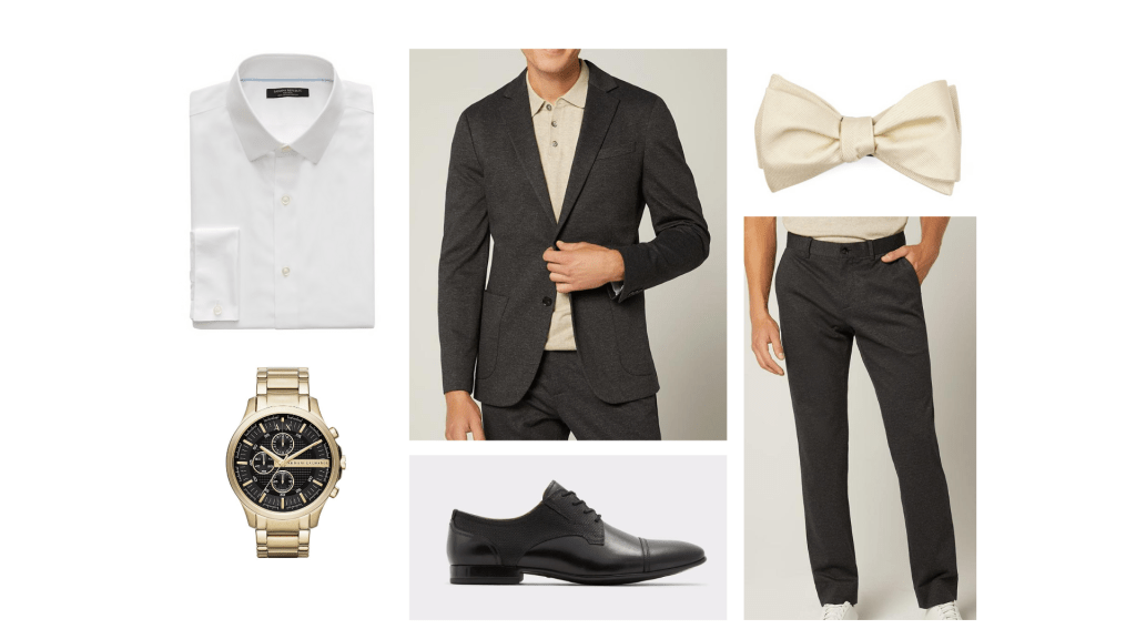 This look was probably the most challenging one to put together. I didn’t know there were so many cuts, colours, and patterns of suits out there which made it a little overwhelming. Plus I really wanted to be sure that it was true to him and was something he would like. After what seemed like hours of searching I finally decided on this dark grey suit. I thought the colour would look great on him and is a bit different from the classic black and blue I see people go for. Under it I paired a crisp white button down. He loves bow ties so I selected this champagne one as I thought it made the look very classic. To accessorize I paired it with this gold watch for a pop. Slip on some back dress shoes and he is ready for a fancy outing.