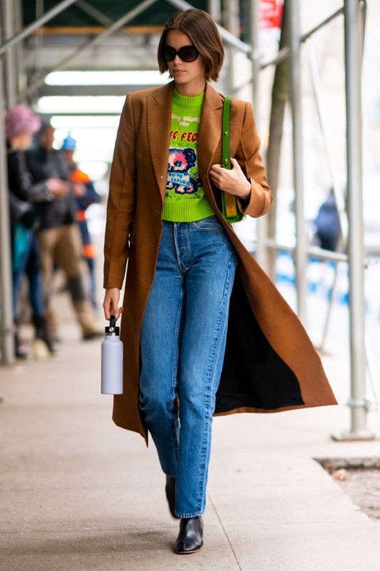 I selected this first look because I loved the pop of colour she added to elevate an otherwise basic look. Kaia really has fun with her style and does not take it too seriously. The sunglasses and bag paired together give the look a very 90s vibe that is super on trend this season.