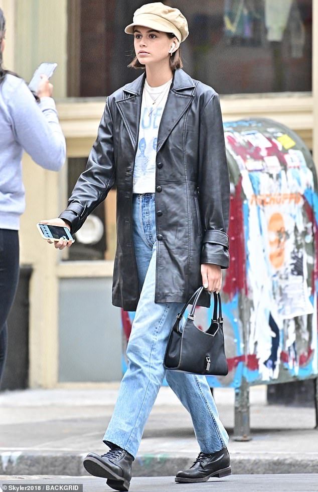 This is my favourite look of Kaia’s. This is a perfect example of a model off duty look as it laid back while also being very on trend. I would remove the tie from the leather jacket and crop the graphic tee that I included in the recreated look to make them more identical to hers. As you can see she loves to include combat boots and hats in her looks.