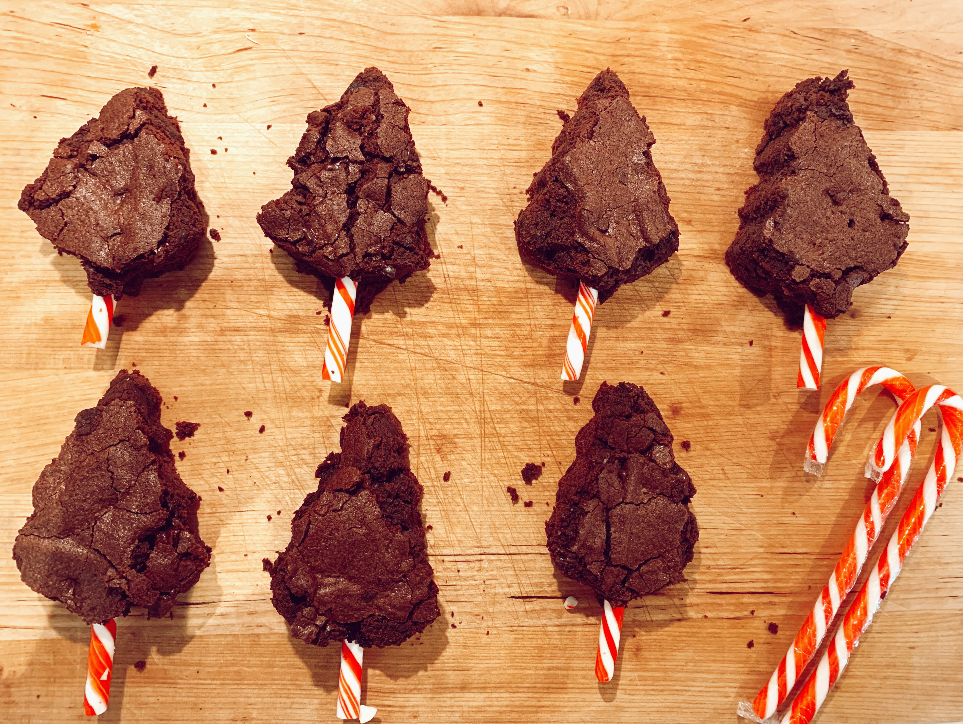 - Get your candy canes and cut a portion of it and insert it into the brownie to act as the stem of the tree.
