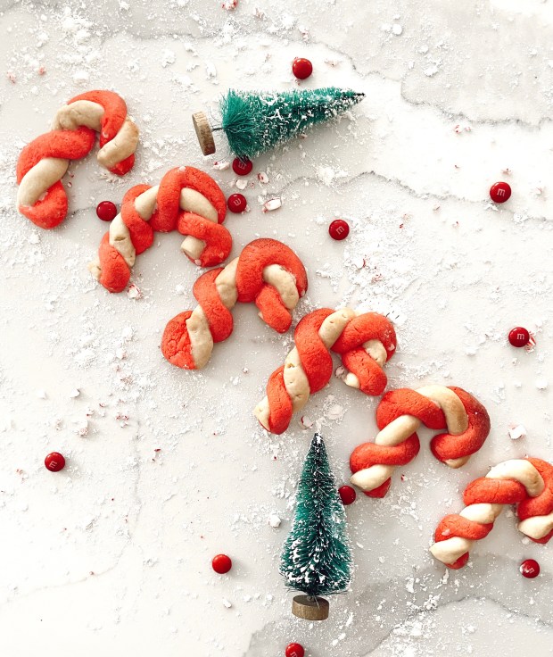 - Twist them together and shape them into a candy cane and place them into parchment paper or a cookie sheet