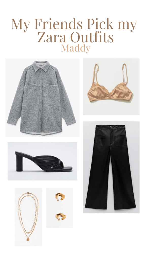 I absolutely love the look that Maddy put together for me. Leather pants are so on trend right now and you all know how much I love a shacket. I have actually never seen this style of mules on Zara’s website before, but I am so happy she found them because they are so chic and for sure something I would wear. The silky bralette top under the shacket is definitely very scandalous but I am not someone afraid to go out of my comfort zone when it comes to fashion. The earrings she picked give me such mejuri vibes and I love how they pair so well with the necklace she chose. This is such a me outfit and for sure something I would wear.