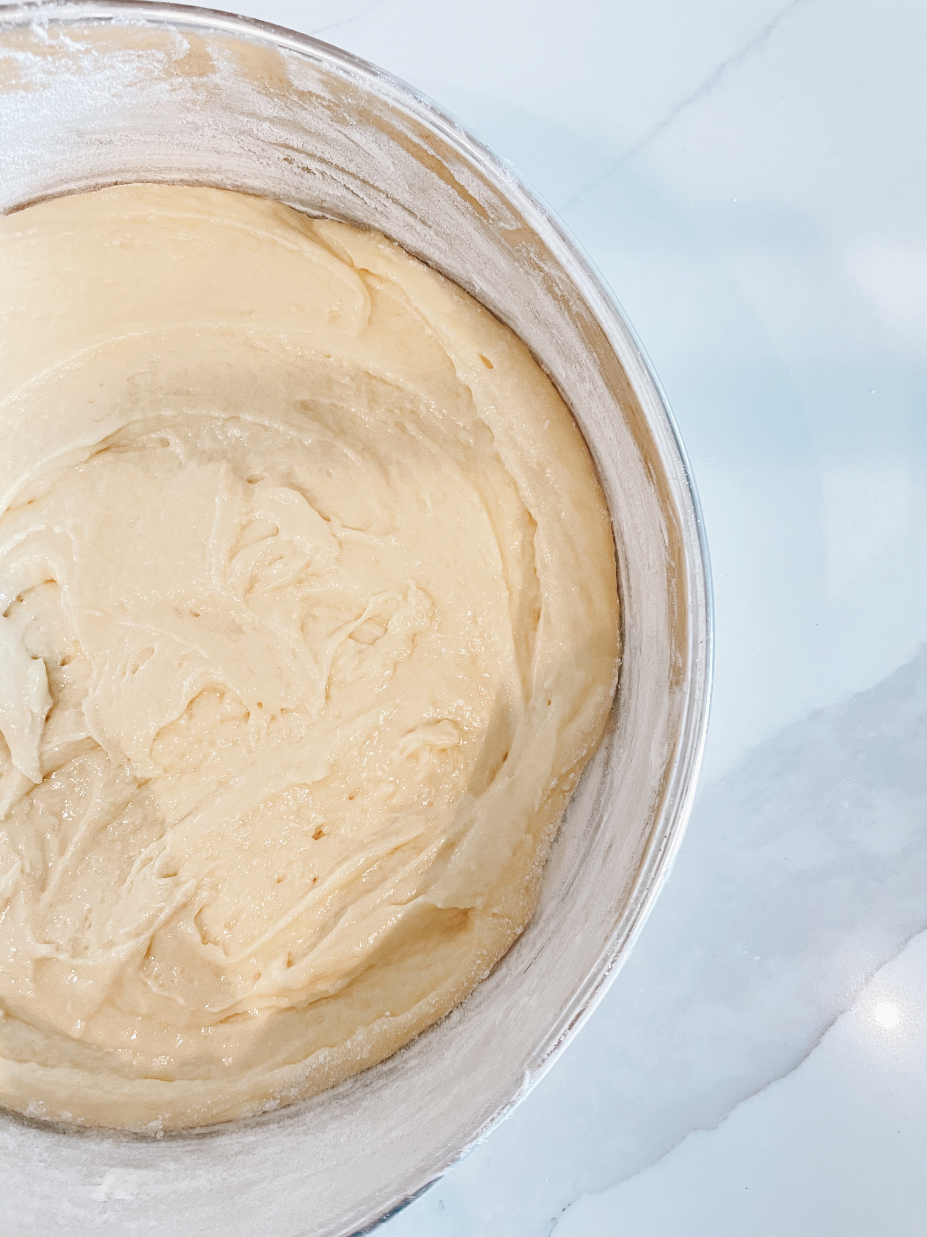 - Slowly add in your flour and mix it until you have a creamy, smooth and thick batter.